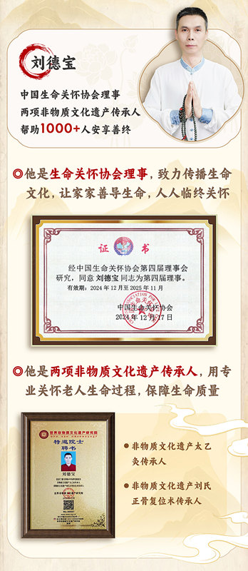 【本网讯】2025年度人物专访:倡导【家庭自助生命关怀】发起人;中国生命关怀协会理事;健康产业发展工作委员会常务委员,永明生命关怀临终指导中心创始人;非物质文化遗产太乙灸;非物质文化遗产刘氏正骨复位,两项非物质文化遗产传承人;北京仁德宝中医研究院院长;推广传统文化践行28年;帮助1000+人安享善终者发愿尽身命,为普及[家家帮家家,人人助人人]之【家庭自助生命关怀】之风尚移风易俗之文化教育实践,奉献一生!